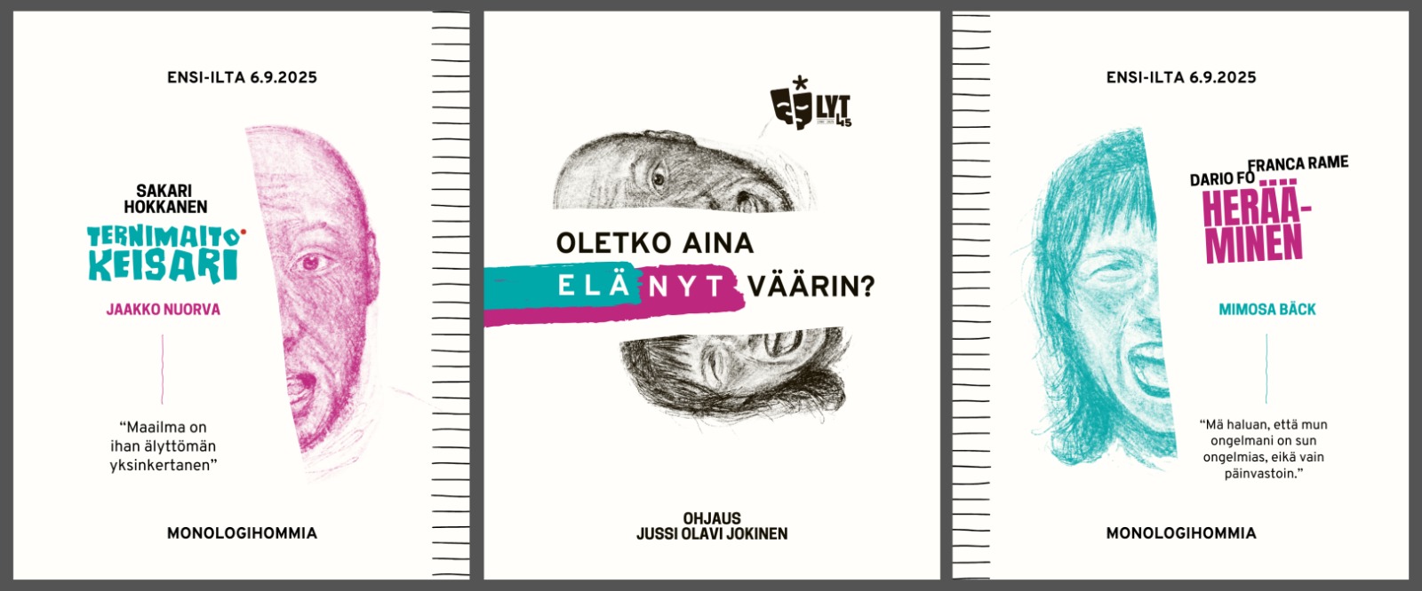 Lapin ylioppilasteatteri aloittaa syyskautena esittämällä kaksi komediallista ja yhteiskunnallista monologia. “Ternimaitokeisari” (2012, Sakari Hokkanen) on sarkastinen ja provosoiva monologi toksisesta menestyskulttuurista ja elämän tarkoituksesta. “Herääminen” (1977, Dario Fo & Franca Rame) puolestaan on humoristinen ja feministinen monologi arjen kaoottisuudesta, työväenluokan elämästä ja inhimillisestä rakkaudesta.