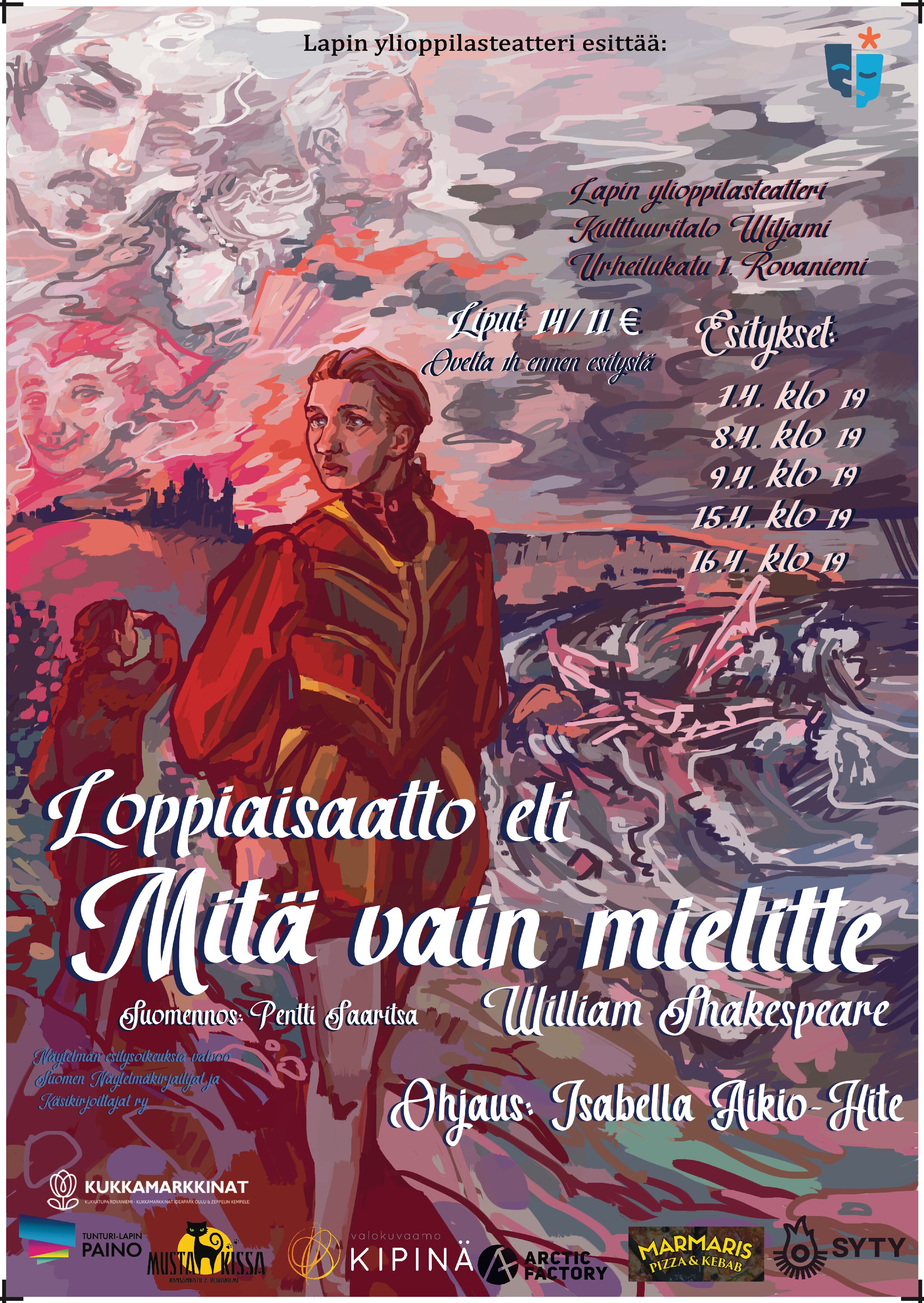 William Shakespearen Loppiaisaatto eli Mitä vain mielitte on rantautunut Rovaniemelle! Tervetuloa kanssamme seikkailulle Illyrian uskomattomaan maahan, jossa rakkaudenkipeät aateliset ja hoviväki narreineen sekoittavat toistensa tunteet solmuun. Tämä klassikkoteos koskettaa iskevällä draamallaan ja hulvattomilla kommelluksillaan.